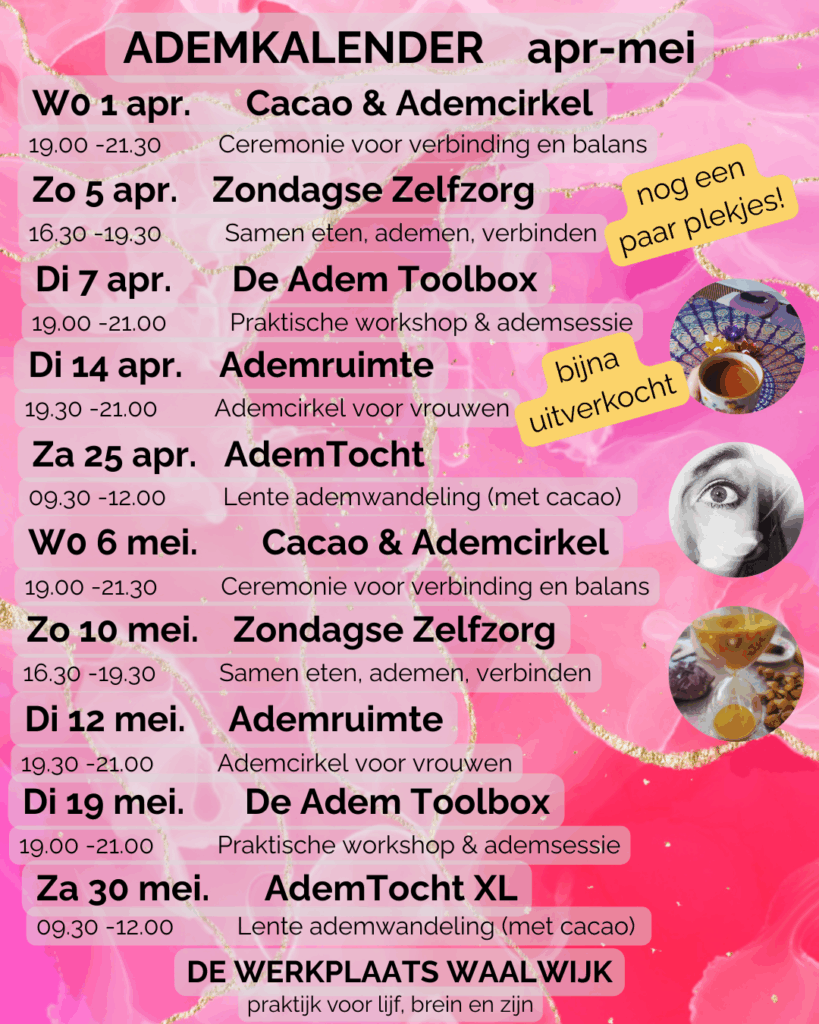 Hier vind je de kalender van wat ik nog meer organiseer bij De werkplaats Waalwijk, praktijk voor Lijf, Brein en Zijn.